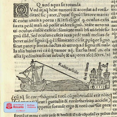 Que el agua tiene una protuberancia y participa de la redondez es claro por lo siguiente: Póngase una señal en la orilla del mar y salga de puerto una nave. Aléjese lo suficiente para que un ojo que está al pie del mástil no pueda ver la señal. Al detenerse la nave, el ojo del mismo que ha subido a la cima del mástil verá bien aquella señal. Mas el ojo del que está al pie del mástil debería ver mejor la señal que quien está abajo, estando más cerca de la señal, como queda claro por las líneas trazadas de cada uno a la señal; de lo cual no hay otra causa que la protuberancia del agua. Exclúyanse todos los demás obstáculos, a saber, nieblas y vapores ascendentes. Además, siendo el agua un cuerpo homogéneo, el todo será de la misma razón que las partes. Las partes del agua (como ocurre en las goticas y rocío de las plantas) buscan naturalmente la forma redonda: por consiguiente también el todo, del cual son partes.