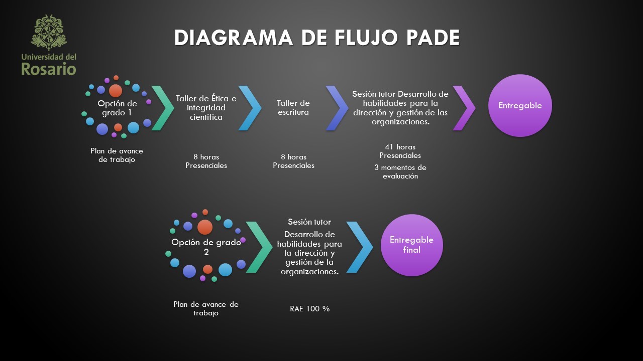 El PADE es un programa de formación para el desarrollo de competencias directivas, con aplicaciones a diferentes aspectos de la vida empresarial y a diferentes sectores económicos. Tal como se mencionó anteriormente, el PADE favorece la continuidad del ejercicio profesional de los estudiantes y en este sentido los lleva a pensar en la solución de retos organizacionales, desde la perspectiva de la gerencia y no del consultor. Una de las principales diferencias entre el PADE y el anterior PAFE es el énfasis en el desarrollo de soluciones empresariales mediante el uso de laboratorios, favoreciendo el desarrollo de habilidades muy demandadas en el contexto empresarial actualmente. Al igual que en las otras opciones de grado, la formación del PADE se materializa en dos momentos, que se describen a continuación: