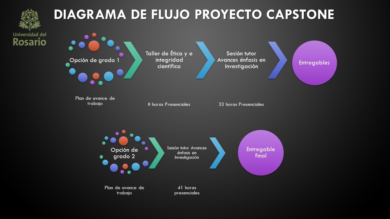 - De acuerdo con el documento de lineamientos pedagógicos y curriculares de la Dirección Académica de la Universidad del Rosario (2018), cada programa académico debe ofrecer más de una opción de grado “a fin de que los estudiantes tengan diversas alternativas que les permitan construir su ruta formativa y proyectar la continuidad de su formación posgradual o de su ejercicio profesional” (p. 44).