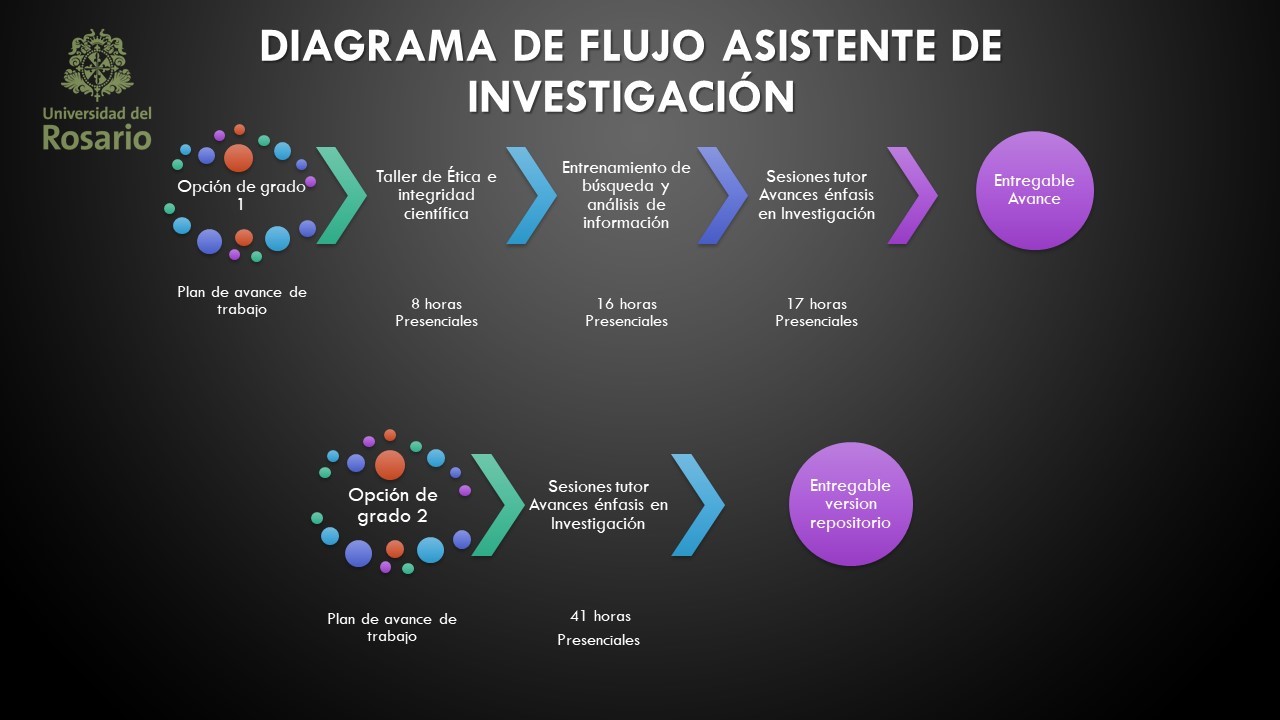 De acuerdo con el Documento de lineamientos curriculares y pedagógicos de la Dirección Académica (2018), bajo la figura de Asistencia de Investigación el estudiante de pregrado “podrá apoyar el diseño y ejecución de proyectos de investigación formales, adscritos a un grupo de investigación de la Escuela o Facultad o de instituciones con las cuales media un convenio de cooperación académico para la puesta en marcha de proyectos conjuntos” (p. 47). Dicho documento señala además que esta labor se debe desarrollar por el estudiante bajo la supervisión de un profesor de carrera de la universidad, que, en el marco de su ejercicio como investigador, acompañe el proceso de aprendizaje del estudiante.