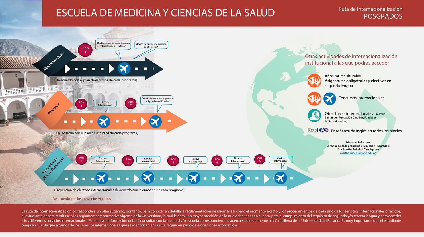 De acuerdo con la política institucional de internacionalización y con la estructura curricular de los programas de pregrado y posgrado en la Escuela de Medicina y Ciencias de la Salud, se han diseñado infografías particulares que buscan orientar al estudiante en la ruta sugerida para tener en cuenta el cumplimiento de requisitos de segundo idioma, oportunidades de cursar asignaturas en inglés o planificar sus semestres internacionales.