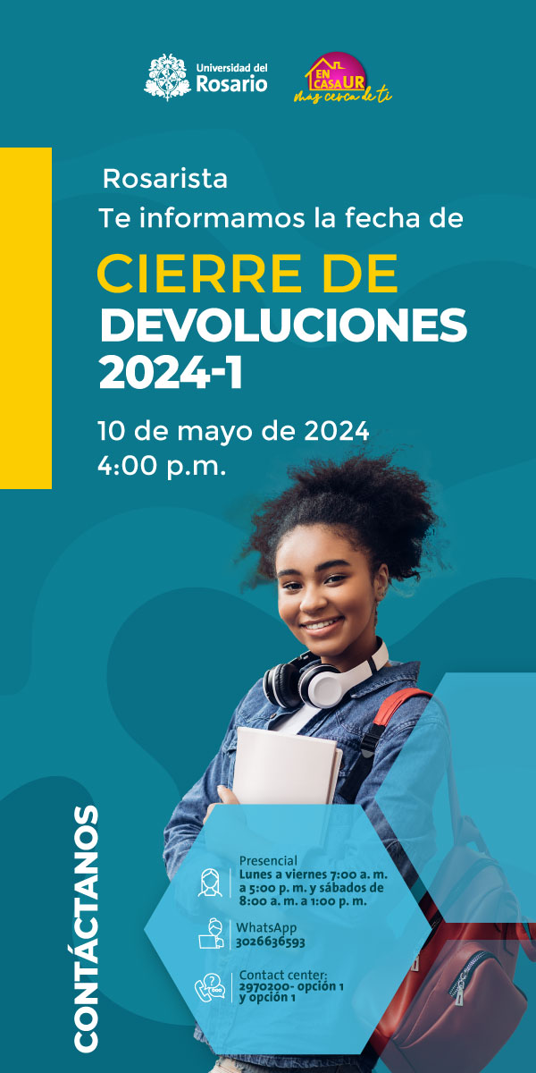 - Efectivo o cheque al día: puedes realizar el pago en las oficinas del Banco Davivienda, Acciones y Valores y Bancolombia a nivel nacional. Cheque girado a nombre del Colegio Mayor de Nuestra Señora del Rosario Nit.860.007.759-3, al respaldo debes diligenciar los siguientes datos del estudiante: nombre completo, número de identificación, celular y programa.