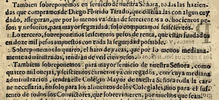 “También sobreponemos en servicio de nuestra Señora, todas las haciendas que compramos de Diego Florido Tirado, que cultivadas con algún cuidado, aseguran, que por lo menos valdrán de setecientos a ochocientos pesos: y nosotros, para mayor seguridad, solo computamos seiscientos. Lo tercero, sobreponemos seiscientos pesos de renta, que están fundados en doce mil pesos impuestos con toda la seguridad posible. Sobreponemos lo cuarto, el hato de vacas, que por lo menos medianamente administradas, tendrán de “ver” cien pesos. También sobreponemos para mayor servicio de nuestra Señora, como cuatro mil ovejas, y seiscientos carneros ya entregados, con cuya mediana administración, tendrá este Colegio Mayor de nuestra Señora toda la carne necesaria, no solo para los alimentos de los Colegiales, sino para el sustento de todos los Convictores, que sobrevinieren, por muchos que sean”.