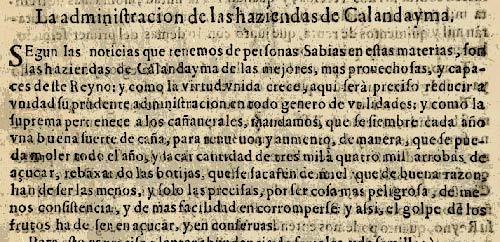 “Según las noticias que tenemos de personas sabias en estas materias, son las haciendas de Calandaima de las mejores, más provechosas y capaces de este Reino.... Mandamos que se siembre cada año una buena suerte de caña.... Y sacar cantidades de tres a cuatro mil arrobas de azúcar, rebajando las botijas que se sacaren de miel, que de buena razón han de ser las menos, y solo las precisas, por ser cosa más peligrosa, de menos consistencia y de más facilidad en corromperse: y así, el golpe de los frutos ha de ser en azúcar y en conservas”.