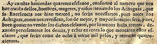 “Hay en estas haciendas cuarenta esclavos, conforme al número que nos han traído de ellos, hombres, mujeres y niños: teniendo los Achaguas, que su Excelencia nos hizo merced, no serán necesarios, pues antes los Achaguas, como nos certifican, son de mejor, y mayor servicio: será, pues, buen gobierno vender los dichos esclavos, por lo menos hasta treinta, dejando precisamente los demás, y echar en renta lo que montaren estos esclavos, que serán como de ocho a nueve mil pesos, y rentarán cuatrocientos”.