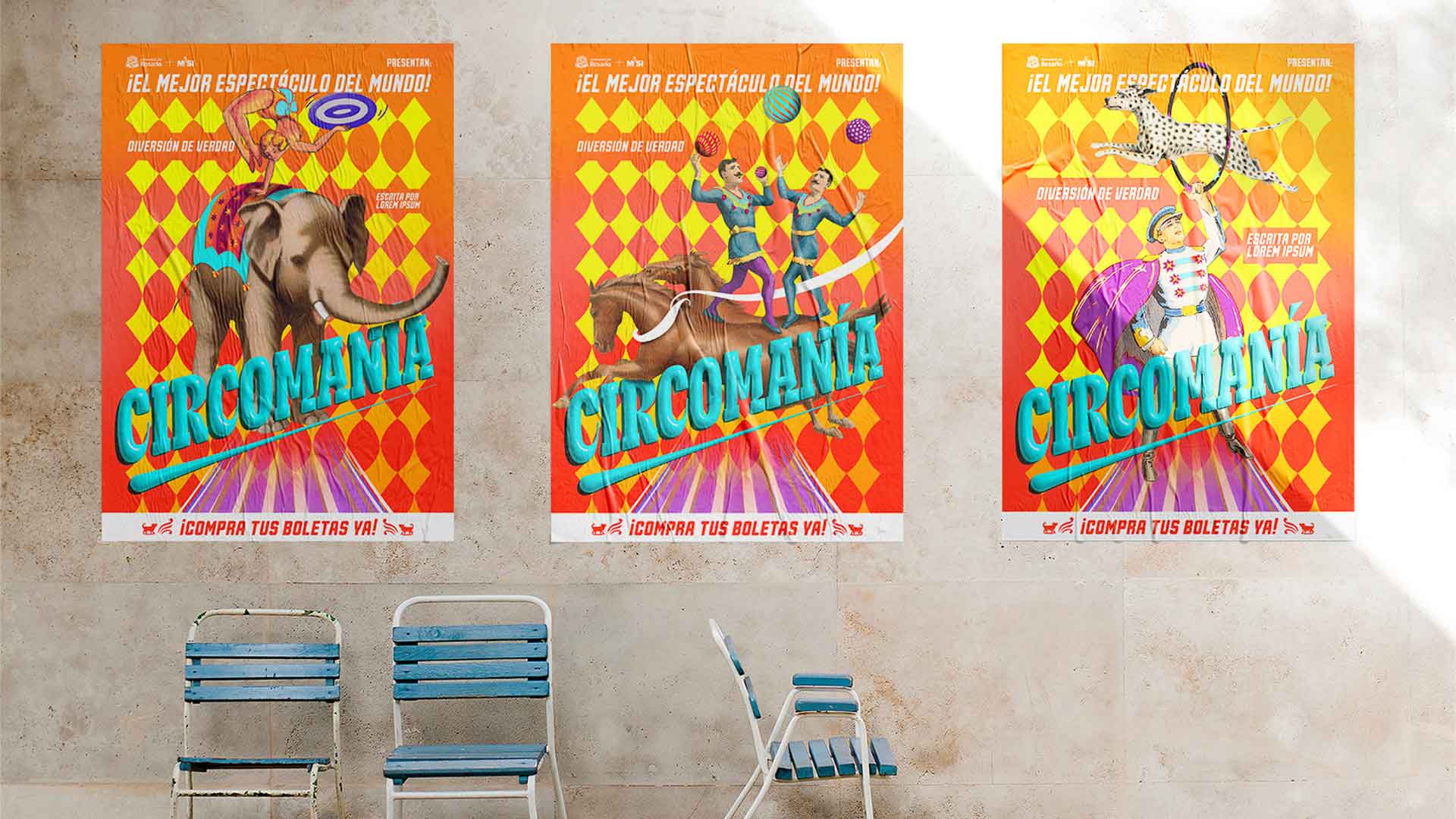 Esta propuesta de diseño combina dos palabras clave traducidas a elementos visuales, inicialmente parte de la Vibrancia llamando elementos comunes del circo como sus colores, patrones y texturas; y los cruza con la Nostalgia, es decir, elementos y situaciones a modo de collage que remiten a las situaciones de este tradicional espectáculo y nos ubica en un universo visual rico, dinámico e inesperado.