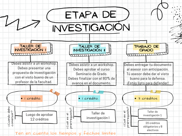 La inscripción de las asignaturas Taller de investigación I y II, así como Trabajo de grado la debe realizar el estudiante en la fecha y hora de inscripción de materias para el periodo académico en el cual realizará cada taller y el proyecto de investigación. Es importante tener en cuenta que, de acuerdo con el reglamento académico, el estudiante tiene 3 semestres después de haber aprobado todas las asignaturas para sustentar la tesis y contar con la nota en el sistema académico. Es responsabilidad del estudiante inscribir la asignatura Trabajo de grado una vez culminadas todas las demás asignaturas del programa.