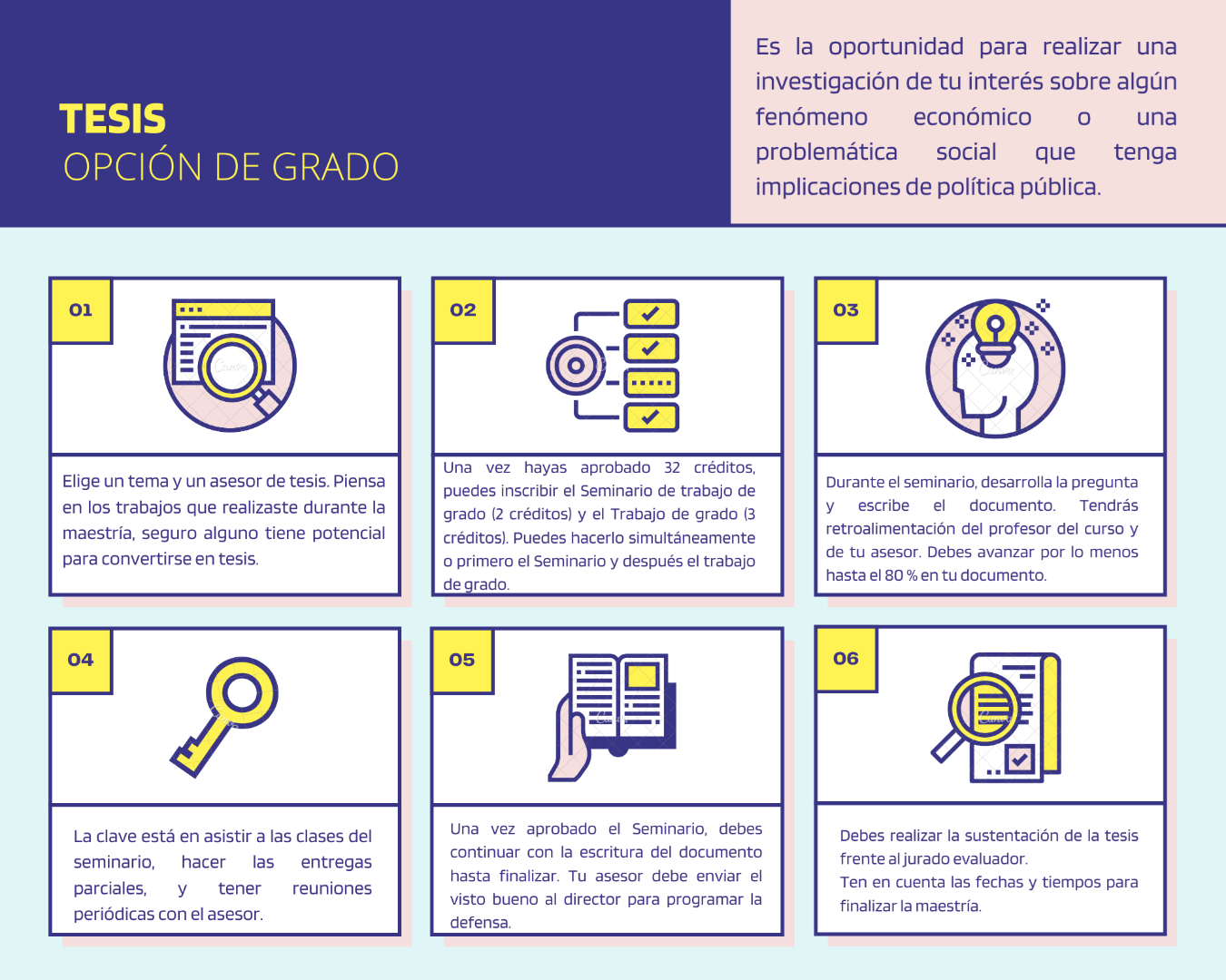 El plan de estudios de la Maestría en Economía de las Políticas Públicas finaliza con el desarrollo de una de las dos opciones de grado disponibles, las cuales consisten en realizar una Tesis o un Capstone Project; ambas modalidades están compuestas por cinco (5) créditos y se distribuyen entre un seminario de opción de grado (2 créditos) y un trabajo escrito, junto con la defensa (3 créditos).