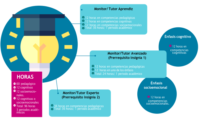 La primera insignia consta de 24 horas mínimo, las cuales deberán estar conformadas por 08 horas de formación en competencias pedagógicas y didácticas, 12 horas de formación en competencias cognitivas y 08 horas en competencias socioemocionales. El tiempo para desarrollar la totalidad de 24 horas para alcanzar la insignia es de un semestre académico.