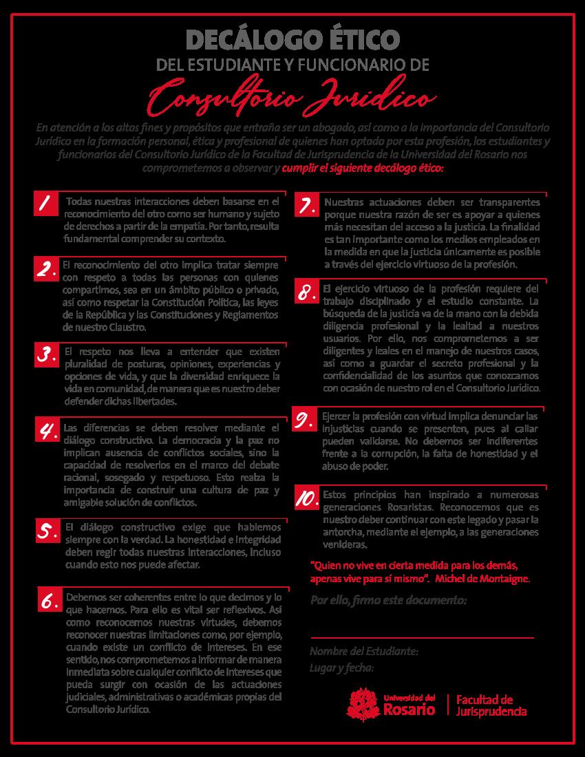 formación académica, los estudiantes también firmarán un Decálogo, al concluir su paso por la Universidad; sin embargo, en este, su compromiso será con ellos mismos y con Colombia, comprometiéndose a ser excelentes abogados, pero sobre