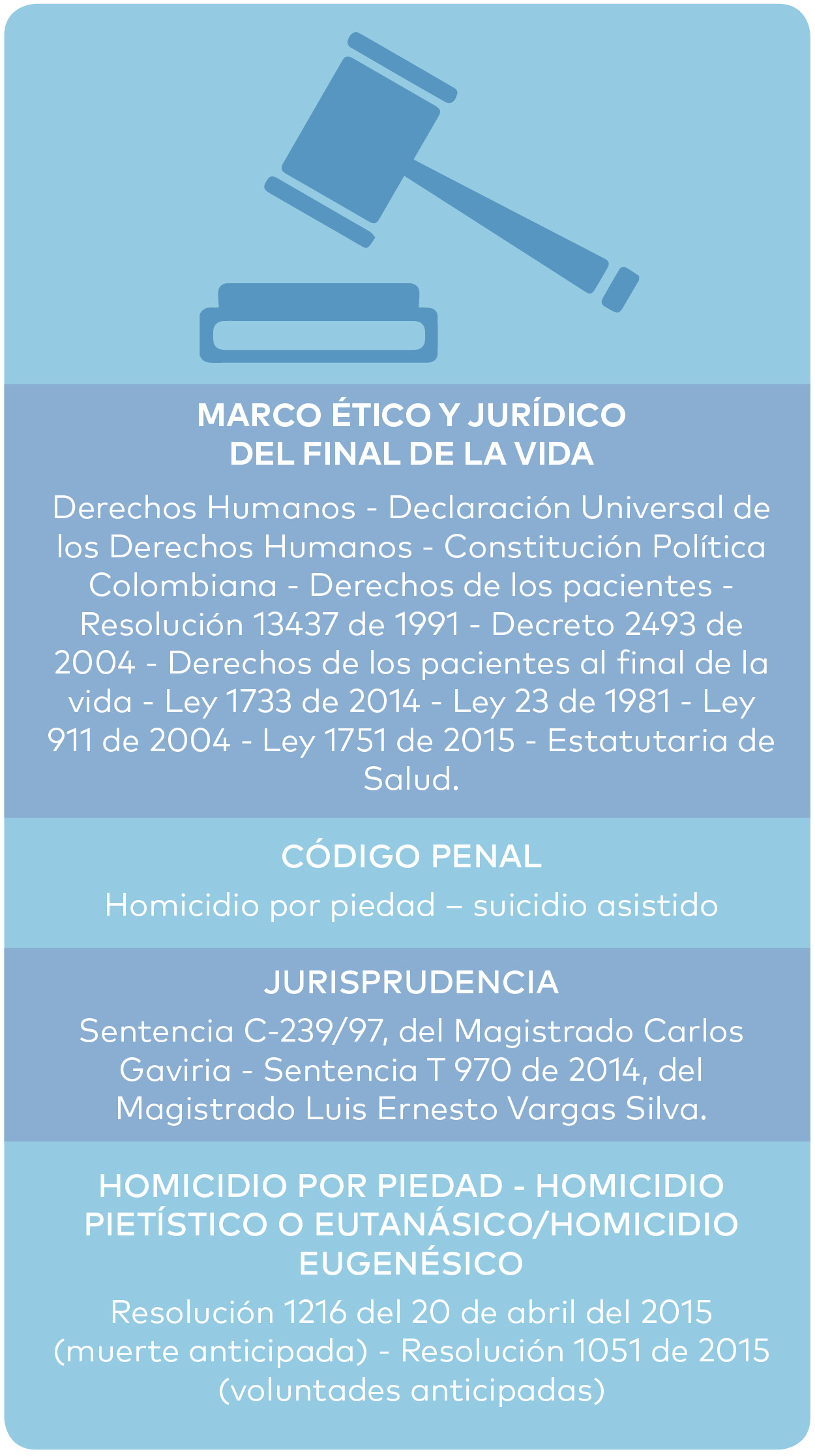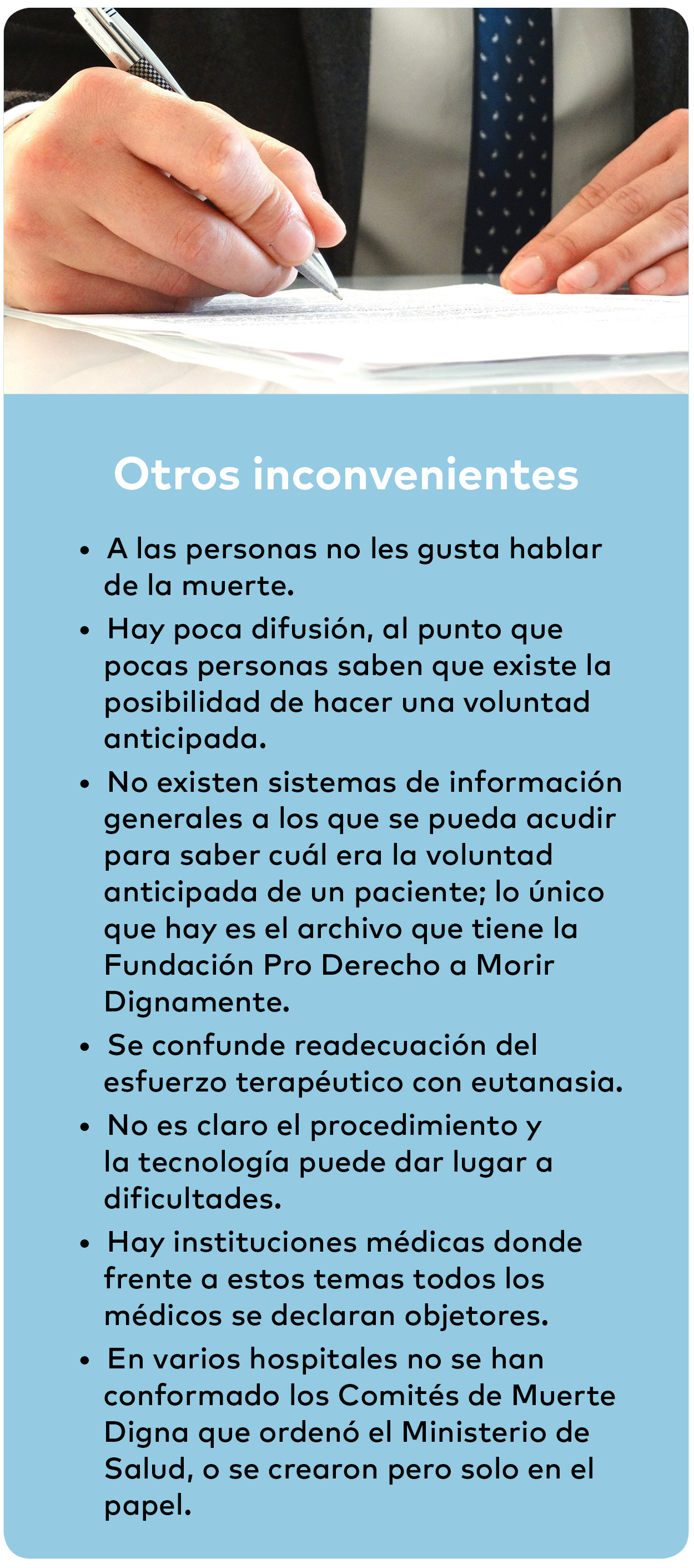 En el país existe un marco jurídico que se refiere a las voluntades anticipadas: la Ley de Cuidados Paliativos; la resolución sobre muerte anticipada, sentencias de la Corte y la resolución sobre voluntades anticipadas, la cual ha recibido profundos cuestionamientos de parte de los expertos.