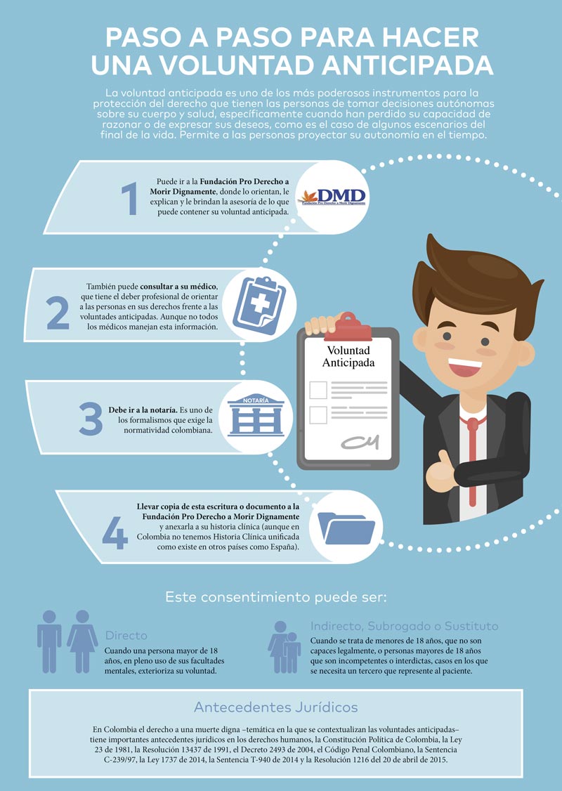 En Colombia hoy es posible suscribir una voluntad anticipada, de manera que se respete lo que la persona quiere al final de su vida; en otras palabras, un consentimiento informado proyectado en el tiempo, que además tiene toda la validez legal.