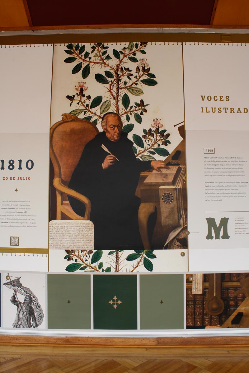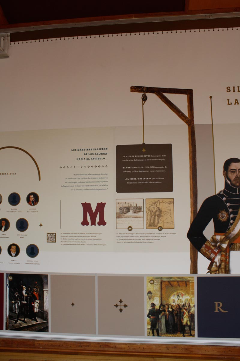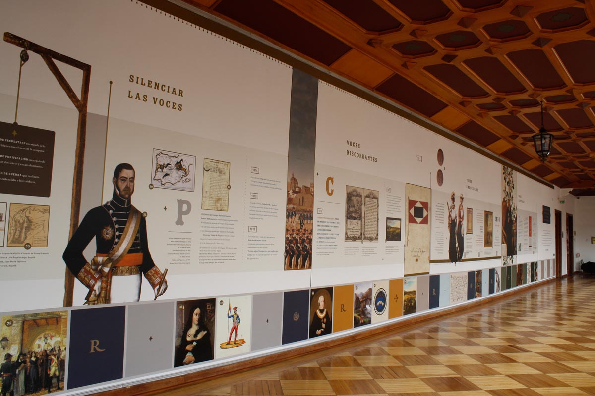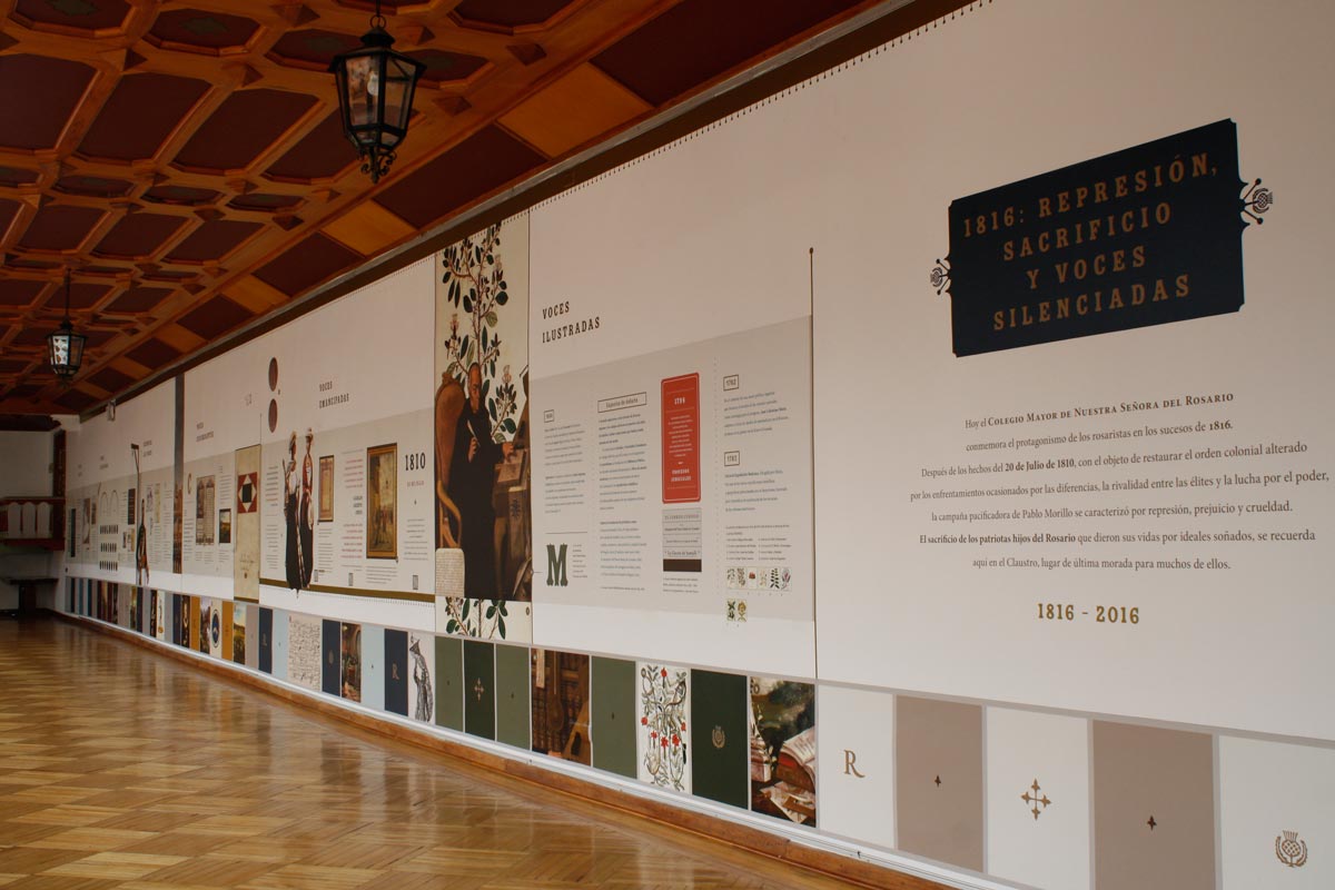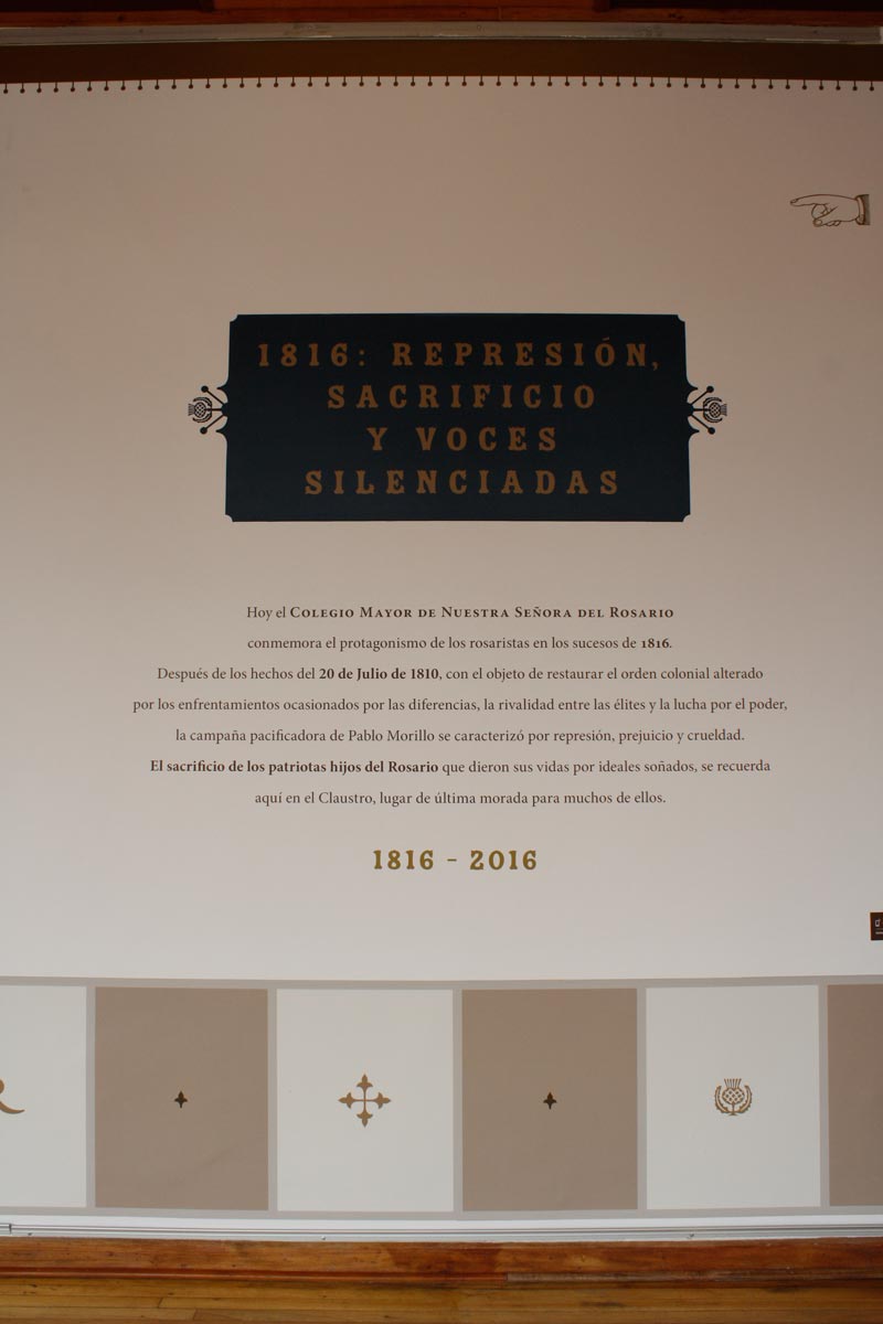 En el marco histórico del bicentenario de la Pacificación de 1816, la Universidad del Rosario presentó la exposición 1816: represión, sacrificio y voces silenciadas, buscando traer a la memoria de la comunidad rosarista, y del público en general, el protagonismo de los rosaristas en los sucesos de 1816. La muestra es un recuento de la historia que tuvo lugar después de los hechos del 20 de Julio de 1810. Con el objeto de restaurar el orden colonial alterado por la rivalidad entre las élites y las voces discordantes en la lucha por el poder, la campaña pacificadora, liderada por Pablo Morillo, se caracterizó por represión, prejuicio y crueldad dirigida en especial contra los intelectuales de la época. El sacrificio de algunos de los patriotas hijos del Rosario se recordó aquí en el Claustro, última morada para muchos de ellos, con el fin de reconocer su valor y sus ideas de nación.