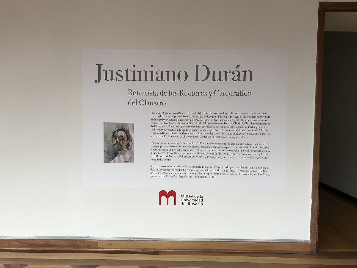 Durante cuatro décadas, Justiniano Durán ha recibido incontables comisiones de gran notoriedad en el género del retrato de parte de diversas instituciones del país. Sus obras encargadas por la Universidad del Rosario marcaron el renacer de la tradición de retratar a los rectores, una práctica que se remonta a los inicios de la institución. Al mismo tiempo, desarrolló una intensa actividad como docente de Historia del Arte, Apreciación del Arte y Retrato en la Historia del Arte en la Universidad del Rosario, y de Dibujo de figura humana en las universidades Javeriana y Jorge Tadeo Lozano.