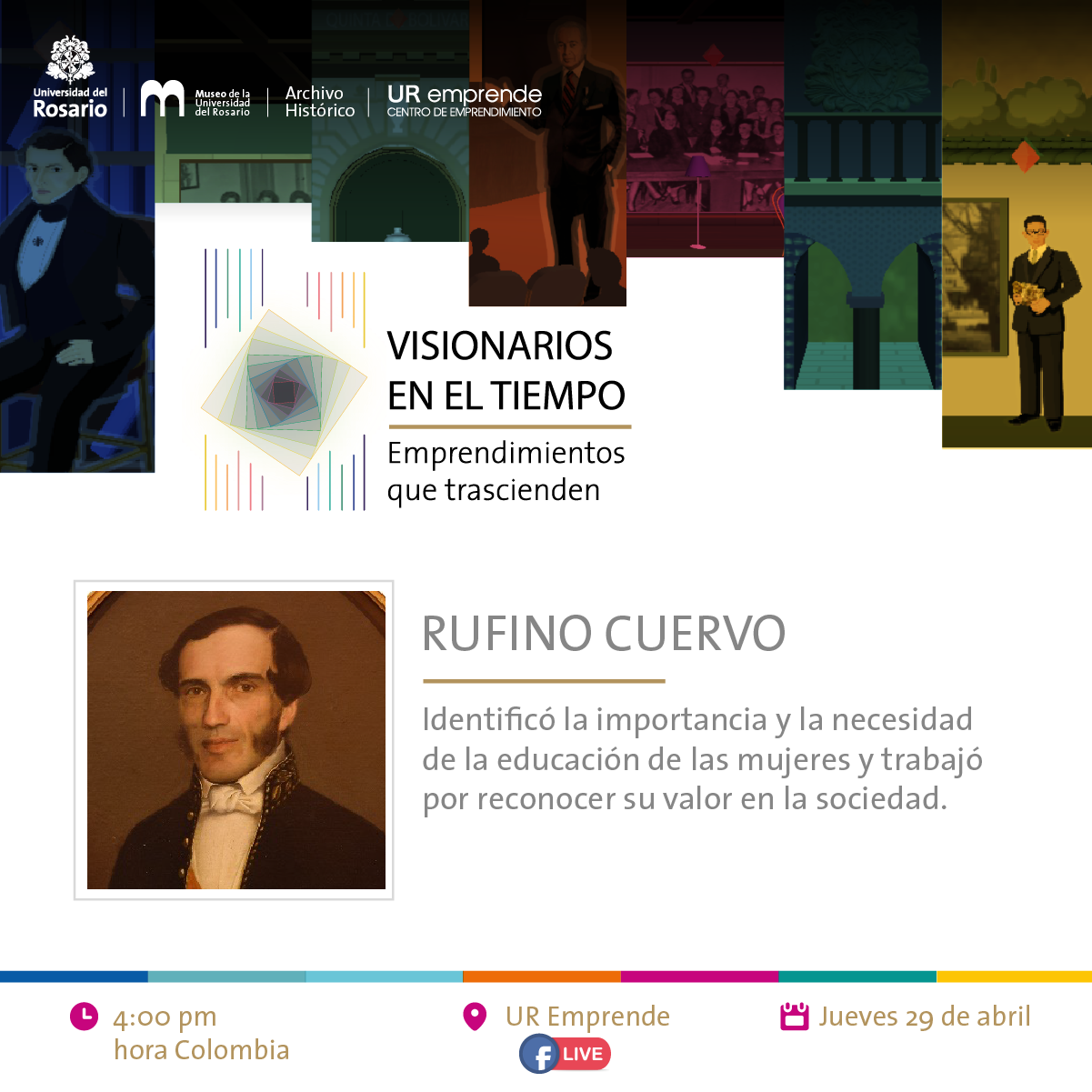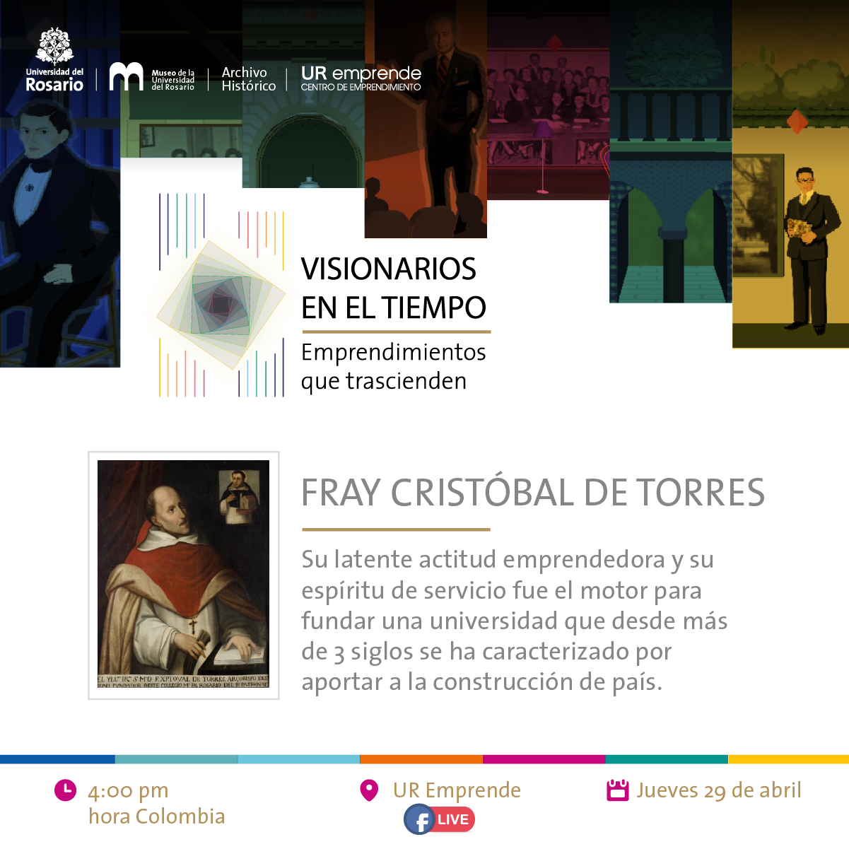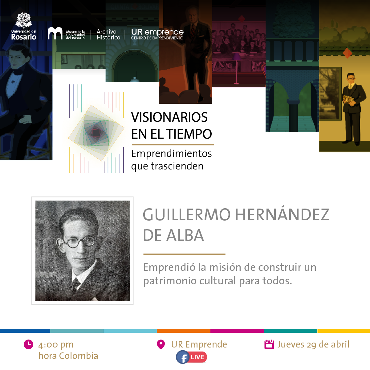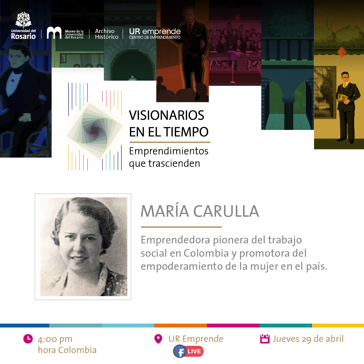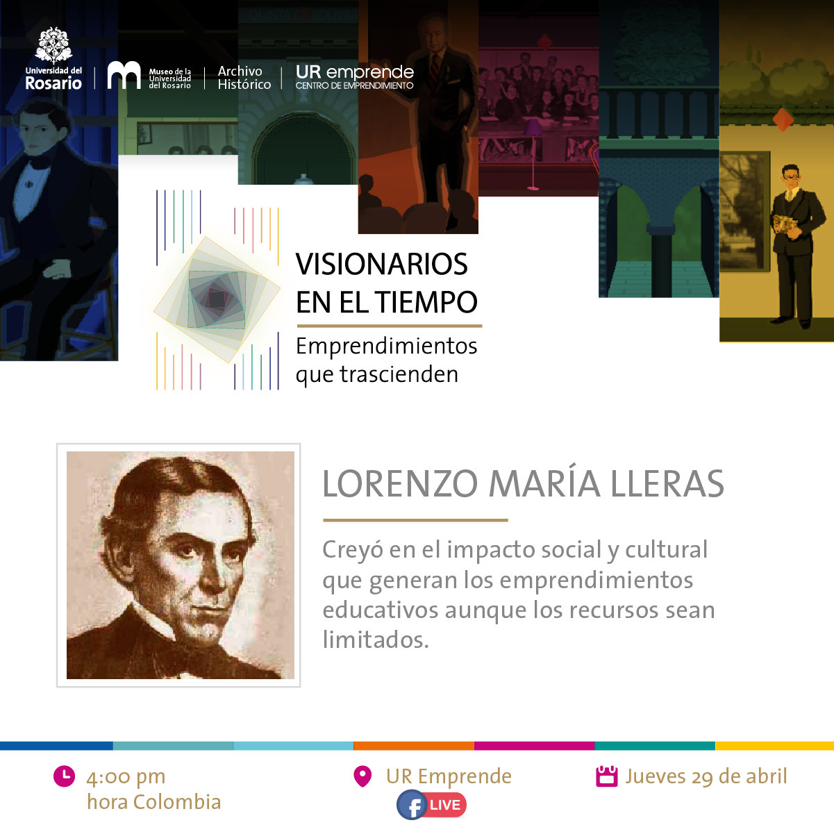 El Centro de Emprendimiento, el Archivo Histórico y el Museo de la Universidad del Rosario han desarrollado la exposición virtual Visionarios en el tiempo: emprendimientos que trascienden, con el objetivo de resaltar a distintos personajes que hicieron parte de la Universidad del Rosario, y han sido reconocidos como emprendedores sociales al preocuparse por generar impactos para el bien común desde cada uno de sus contextos sociales.