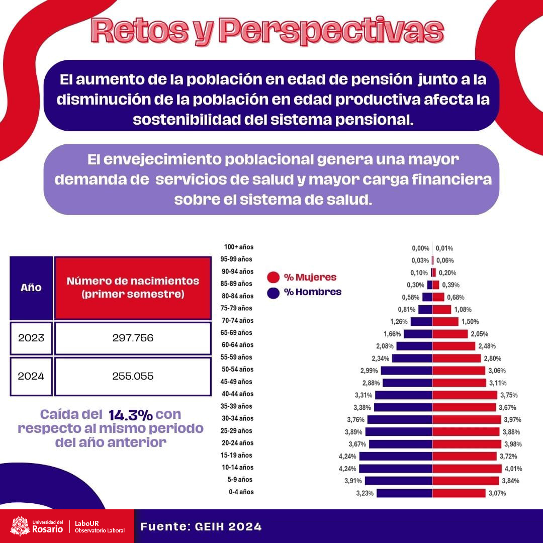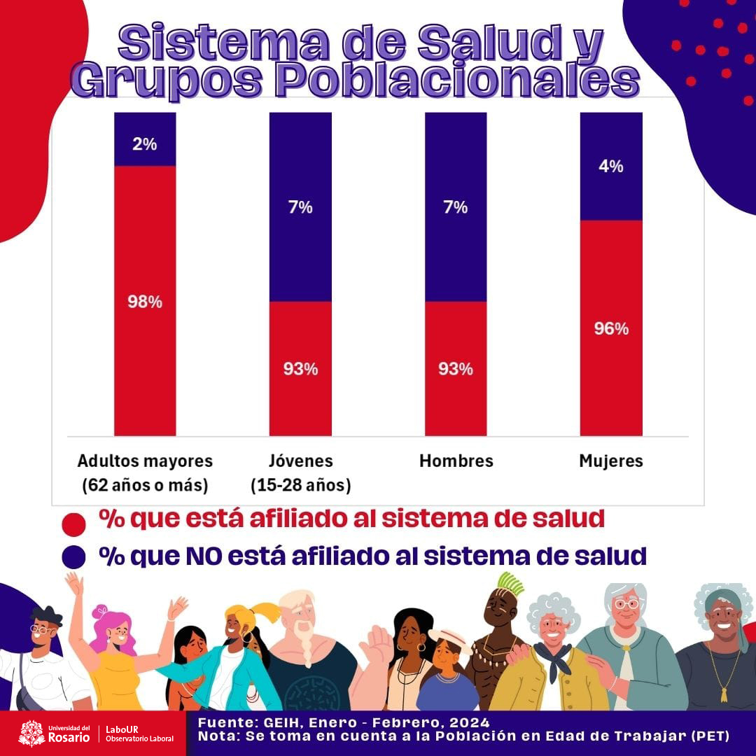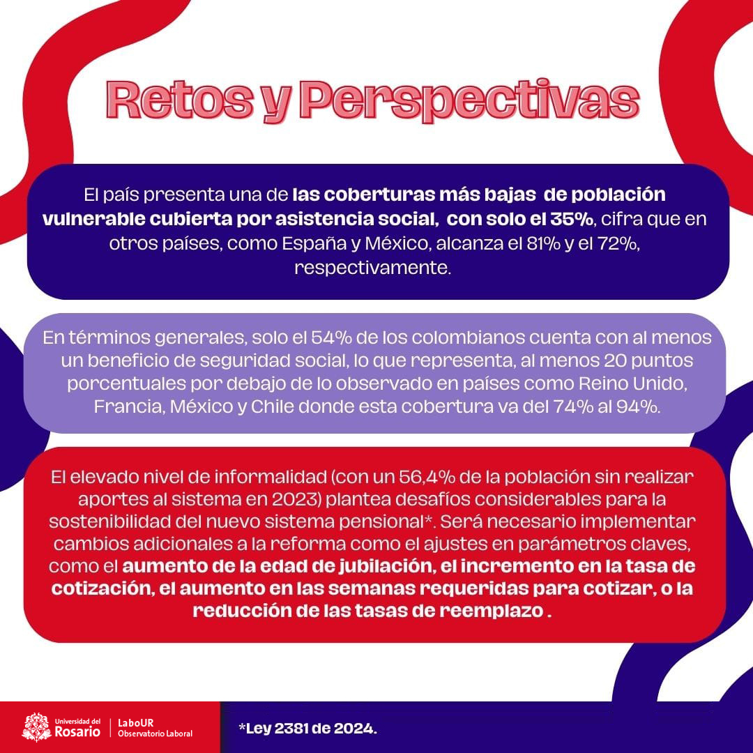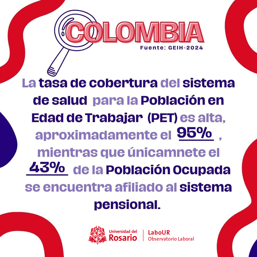 Según Jessica Gil, investigadora del Observatorio, en Colombia la tasa de cobertura de salud para la población en edad de trabajar (PET) alcanza el 95 %. Sin embargo, solo el 43 % de la población ocupada está afiliada al sistema pensional, lo que plantea importantes retos en términos de cobertura y sostenibilidad del sistema.
