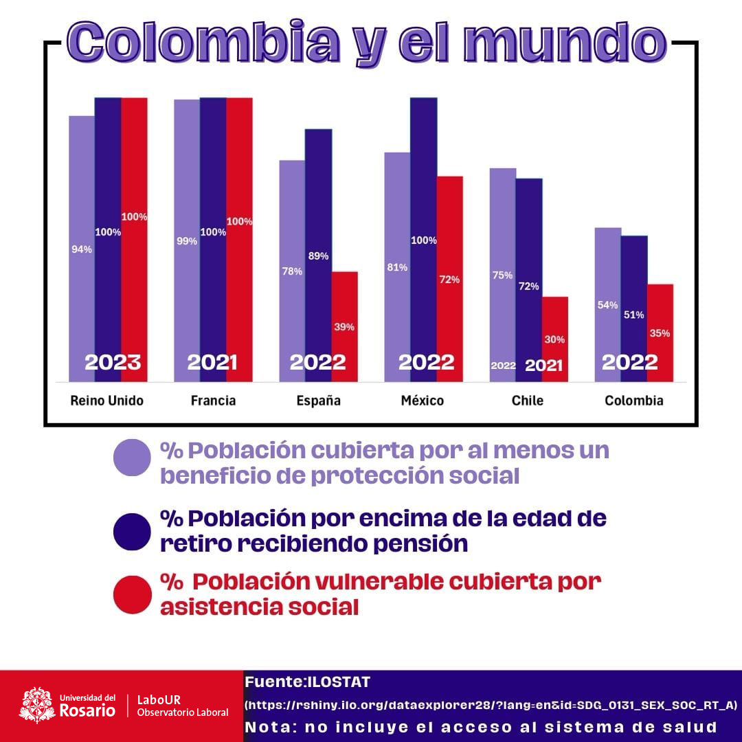 Colombia se encuentra rezagada en materia de protección social. Excluyendo salud, tan solo el 35 % de la población se encuentra cubierta por al menos un beneficio de protección social, contrastado con países como el Reino Unido y México, donde reciben beneficios el 100 % y 72 %, respectivamente, según datos de la OIT.