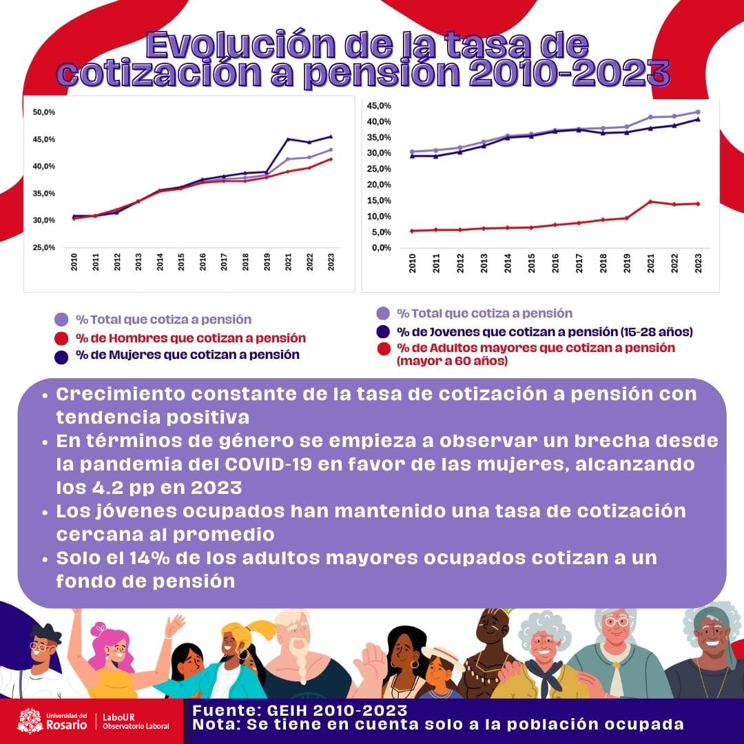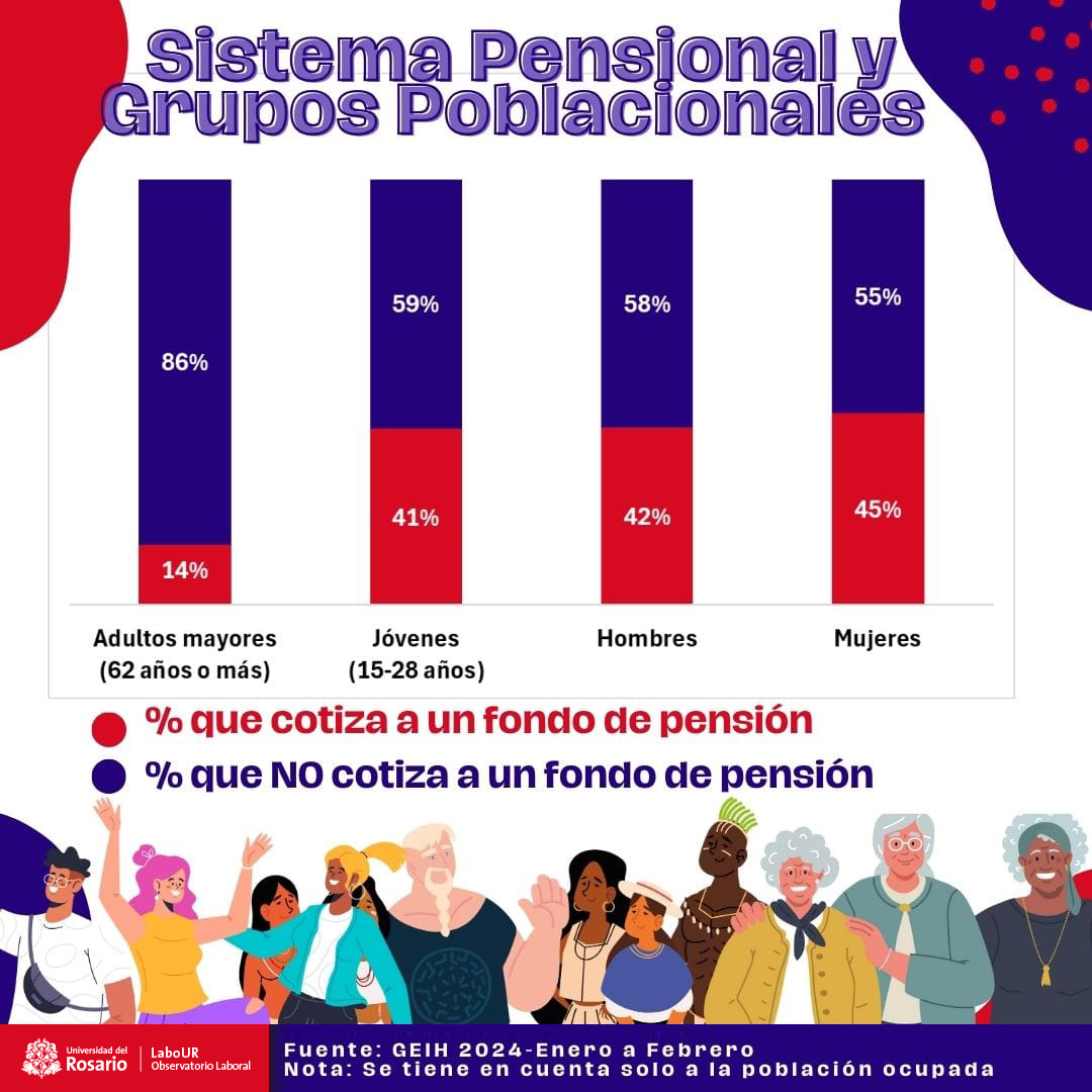 Sin embargo, solo el 14 % de los adultos mayores ocupados cotiza a un fondo de pensión, lo que deja a la mayoría de esta población sin un respaldo económico para su retiro. En contraste, el 59 % de los jóvenes ocupados cotizan al sistema, aunque un 41% aún no lo hace, reflejando la necesidad de impulsar la formalización del empleo juvenil.