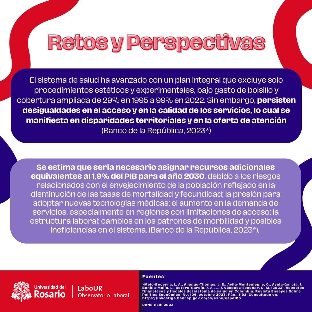 El sistema de aseguramiento enfrenta retos hacia el futuro. Aunque la cobertura de salud supera el 90 %, persisten disparidades territoriales en el acceso, la calidad, y por poblaciones vulnerables, agravadas por factores como el envejecimiento, la adopción de tecnologías médicas y el aumento en la demanda de servicios. Esto podría requerir, según las investigaciones previas, un aumento de hasta el 1,9 % del PIB en recursos para 2030, señaló Diana Mena, investigadora del Observatorio Laboral de nuestra Facultad de Economía.