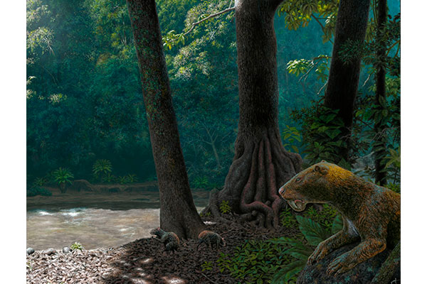 Imagen: Anachlysictis gracilis acechando su presa en el paisaje de hace 13 millones de años,