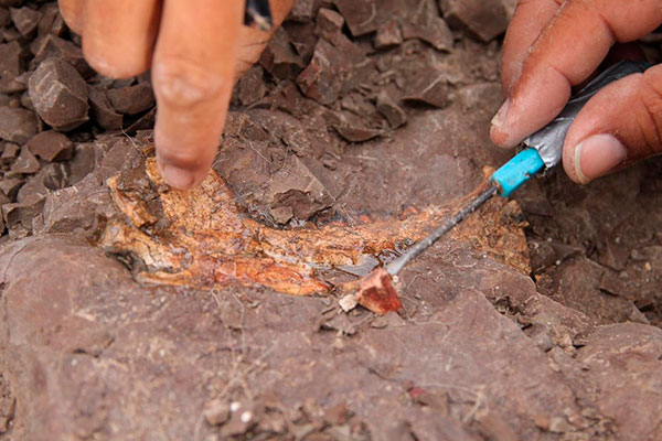 Imagen: Extracción del nuevo ejemplar (se observa el lado izquierdo de la mandíbula, que aún permanecía enterrado).