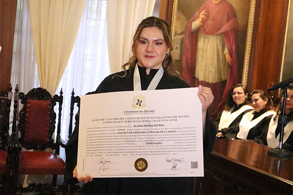 El martes 22 de julio de 2025, en una emotiva ceremonia realizada en el Aula Máxima de la sede Claustro, Eliana Briñez Botero se convirtió en la primera egresada del Programa de Enfermería de la Universidad del Rosario. Este momento marca un hito significativo para la Escuela de Medicina y Ciencias de la Salud, y para la historia de nuestra Universidad.
