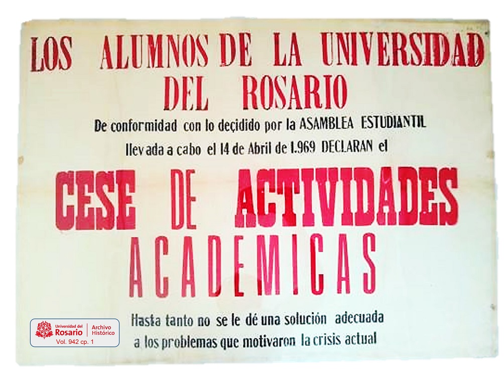 Pieza única en nuestra colección, el afiche que declaraba el cese de actividades en el Rosario, el 14 de abril de 1969.
