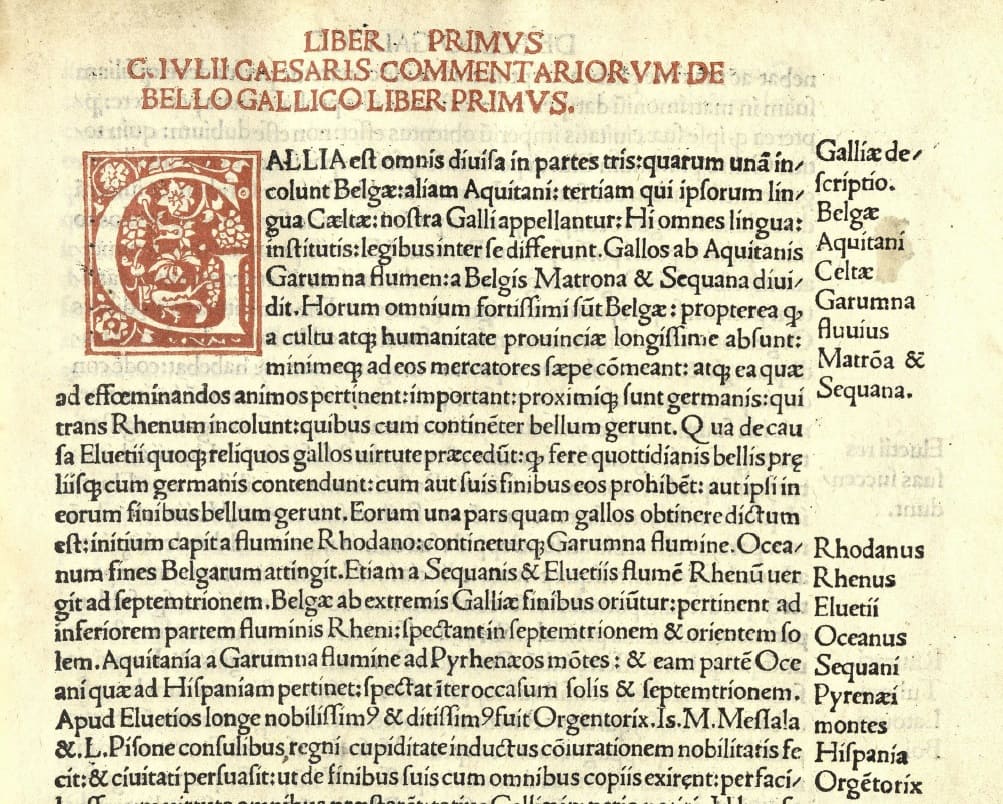 Como procónsul de las provincias de Galia, Julio César sostuvo una dura guerra contra los pueblos bárbaros que se resistían a la dominación romana. Ello se refleja en sus Comentarios sobre la Guerra de las Galias.